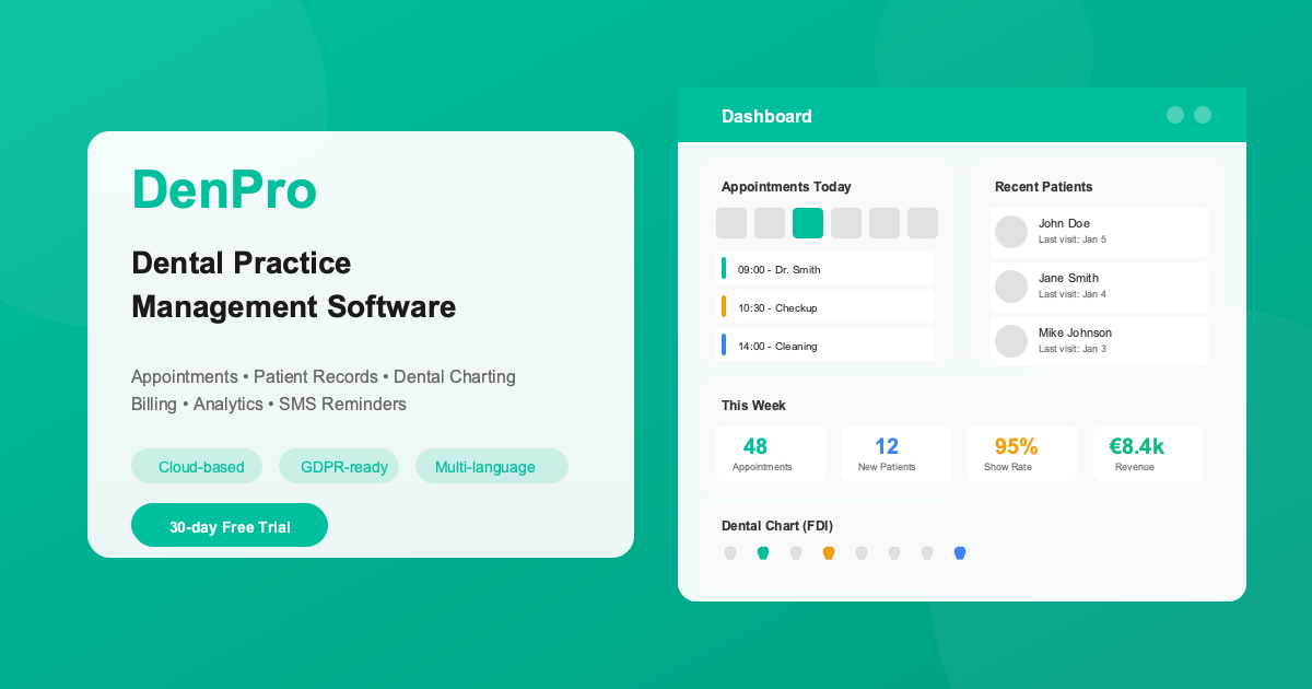 DenPro is a dental practice management software designed for clinics that want faster scheduling, structured patient documentation, and a secure cloud dental clinic system. Use it to manage appointments, patient records, dental charting and daily workflow — built with privacy and data protection in mind.